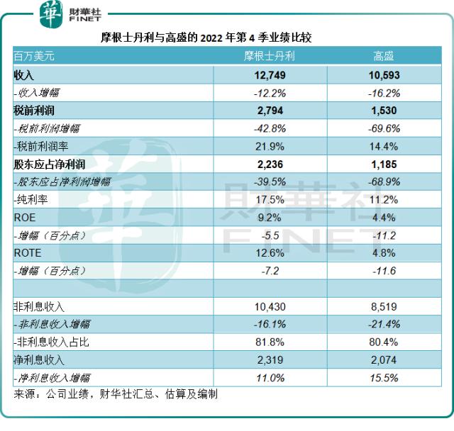 2022年第4季,摩根士丹利的季度收入同比下降12.2%,至127.49亿美元;高盛的季度收入则按年下滑16.2%,至105.93亿美元,主要受期内美联储加息拖累美股整体表现,投行业务显著收缩所影响。