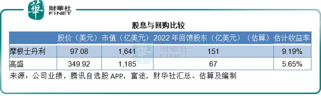 摩根士丹利于2022年回购99亿美元(以均价87.25美元合共回购1.13亿股)。此外,该公司第一季每股派息0.7美元,第2季、第3季及第4季均每股派息0.775美元。按每个季度的期末已发行股份数计算,财华社估计其全年派息金额或达到51.75亿美元,加上回购在内,或合共回馈股东150.75亿美元,相当于当前市值1,641亿美元的9.19%,远高于高盛。