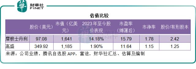 所以,虽然2023年才过了半个月,摩根士丹利2023年以来已累计上涨了14.18%,显著跑赢高盛的1.90%。从估值来看,大摩的市净率高达1.78倍,市盈率也有15.79倍,明显高于高盛的市净率1.15倍和市盈率11.64倍。