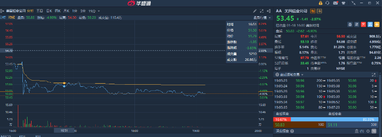 截至发稿,美国铝业周三美股盘后跌4.90%,报50.83美元。