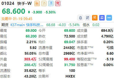 华盛资讯1月19日消息,快手-W跌超5%,现报68.6港元。根据公告,该公司董事长宿华于1月18日交易时段后通过大宗交易减持约5471万股B类股票。快手方面回应称,宿华此次出售所得款项将用于慈善公益捐赠、前沿科技探索以及基础设施投资等领域。