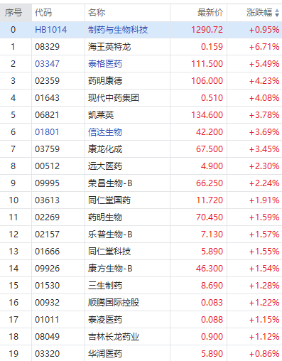 今日港股制药行业龙头走势较强,截至发稿,药明康德涨4.23%,凯莱英涨3.78%,信达生物涨3.69%,康龙化成涨3.45%,荣昌生物涨2.24%,药明生物涨1.59%。