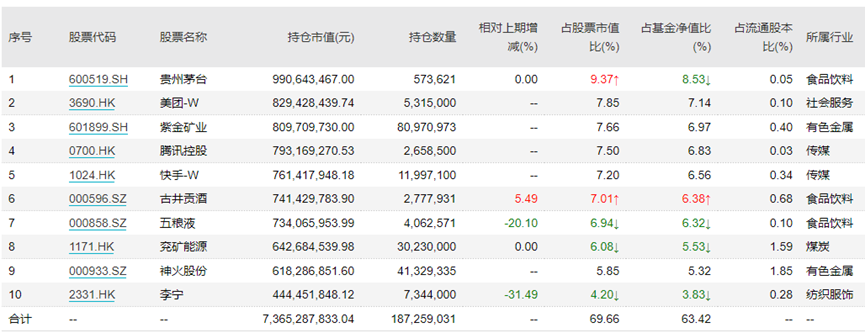 第二大重仓股美团(新晋重仓)、第四大重仓股腾讯(新晋重仓)、第五大重仓股快手(新晋重仓)、第八大重仓股兖矿能源(旧重仓股)、第十大重仓股李宁(旧重仓股减仓)。(以下表为准)