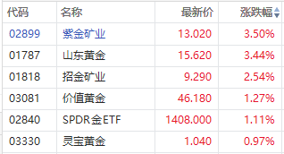 华盛资讯1月20日消息,港股黄金与贵金属板块走强,截至发稿,紫金矿业涨3.5%,山东黄金涨3.4%,招金矿业涨2.5%。