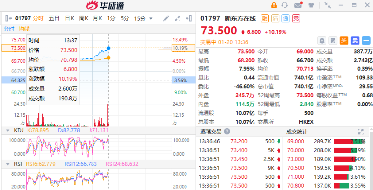 新东方在线(01797)午后持续大涨,截至发稿,该股涨10.19%,现报73.5港元/股,再创上市新高。