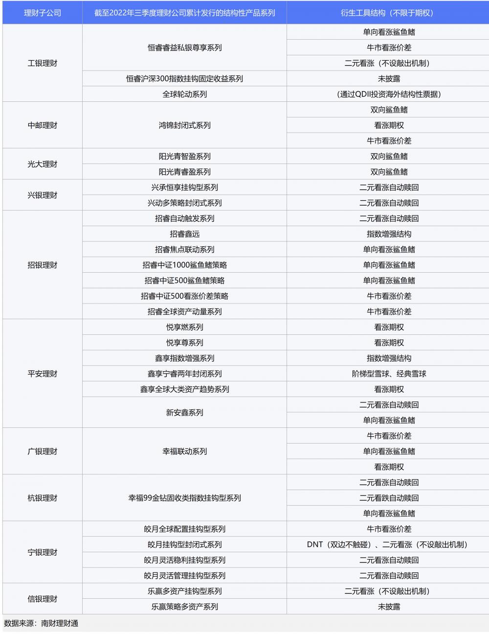 截至2022年三季度,理财公司累计发行的结构性产品系列及衍生工具结构,如下图所示。