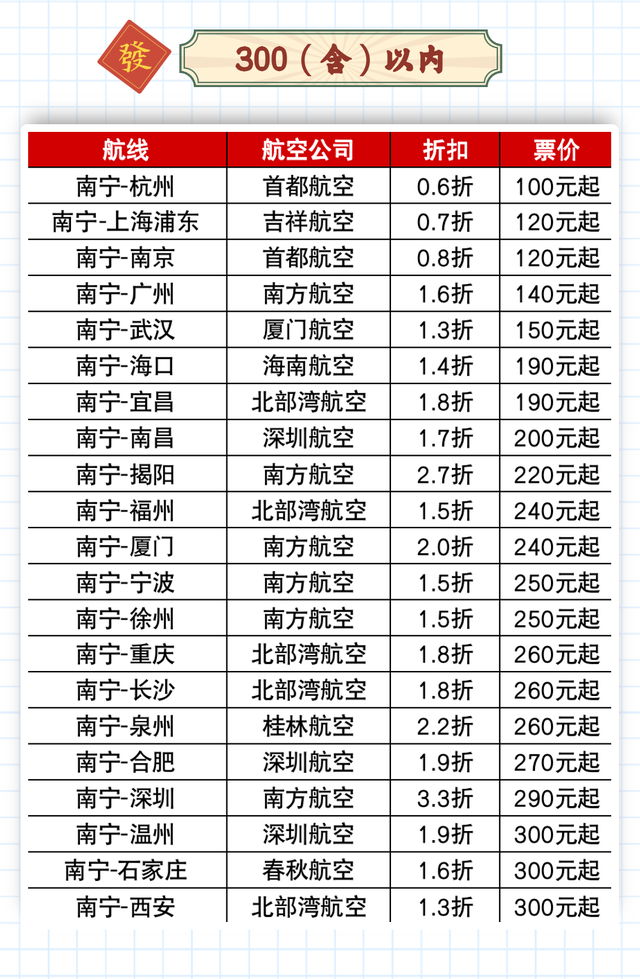 深圳航空广西分公司预计,出行客流量将在正月初六达到高峰。目前南宁飞往深圳、西安、无锡、北京、成都、重庆、武汉、南京等城市机票预订需求较大,预计出现一票难求现象。目前,飞往郑州、合肥、大连、厦门、福州等城市的航班仍有少量5折左右机票。