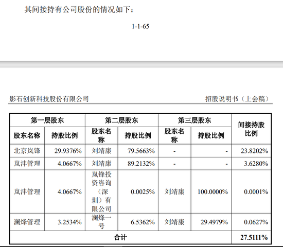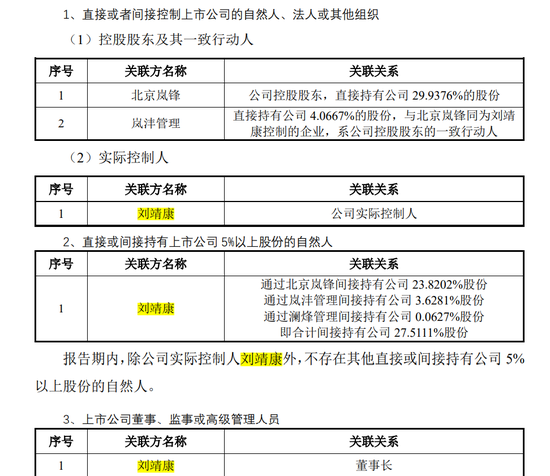 截至 2021 年 6 月 30 日,刘靖康通过持有北京岚锋、岚沣管理间接控制发行人 29.9376%、4.0667%的股份,合计可支配公司 34.0043%的表决权,间接持有公司 27.5111%的股份,系公司实际控制人。