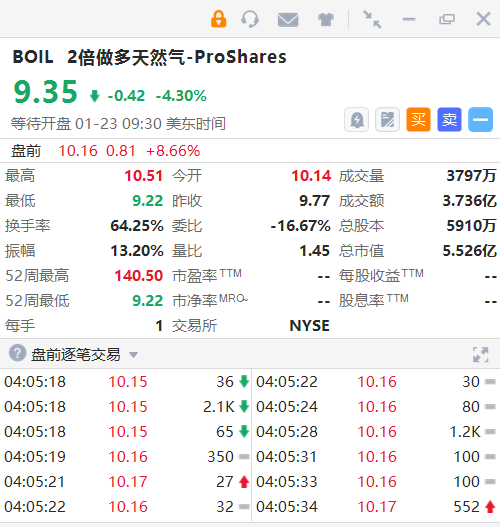 美国天然气期货指数走高,截至发稿上涨8.73%,2倍做多天然气的BOIL $BOIL 涨8.66%,2倍做空天然气的KOLD $KOLD 跌8.41%。