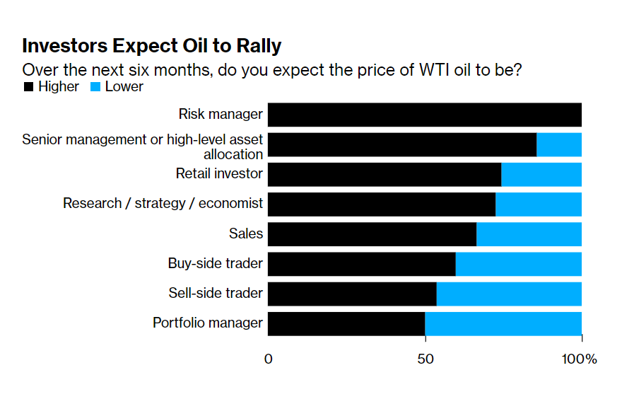 专业投资者和散户投资者都认为未来六个月油价会上涨。前者更为乐观。