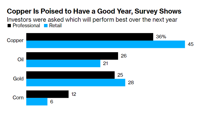一个单独的调查问题显示,与石油、黄金和玉米相比,专业投资者和散户投资者都认为铜是未来一年最有可能跑赢大盘的商品。