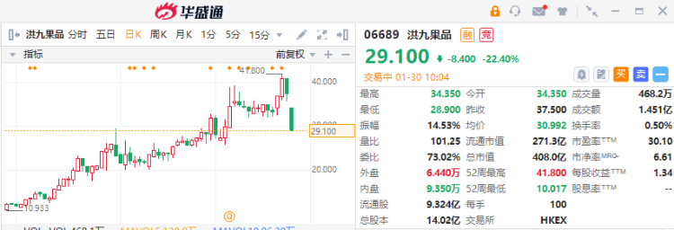 1月30日讯,港股洪九果品(06689)早盘重挫22.40%,现报价29.10港元,当前成交额超1.45亿港元,发布公告,于2023年1月26日按照资本化发行而配发及发行的6.22亿股新H股。