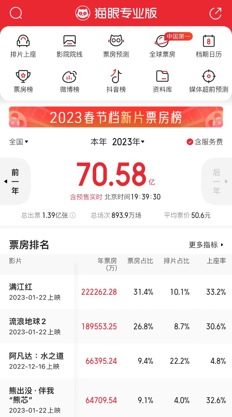 据猫眼专业版数据显示,2023年1月26日18时,2023年度大盘票房(含预售)破70亿。《满江红》《流浪地球2》《熊出没·伴我“熊芯”》分列春节档票房前三位。