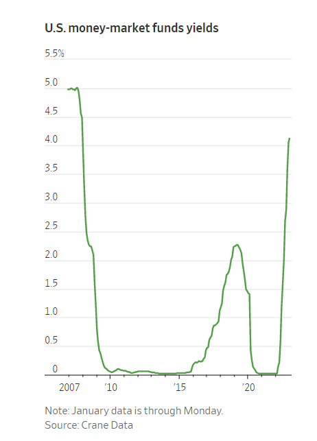 追踪货币市场的公司Crane Data显示,本月美国货币市场基金的平均回报率为4.12%,为2008年金融危机以来的最高收益率。相比之下,标普500指数1月份迄今上涨4.6%,股息收益率约为1.6%。