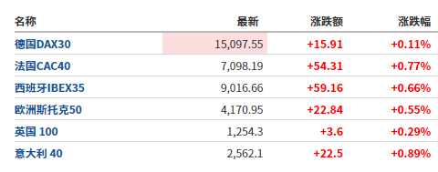 2. 截至发稿,德国DAX指数跌0.11%,英国富时100指数涨0.29%,法国CAC40指数涨0.77%,欧洲斯托克50指数涨0.55%。