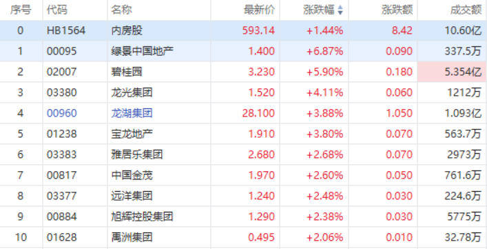 1月27日讯,港股内房股早盘持续走高,截至发稿,绿景中国地产涨6.87%、碧桂园涨5.90%、龙光集团涨4.11%、龙湖集团涨3.88%。