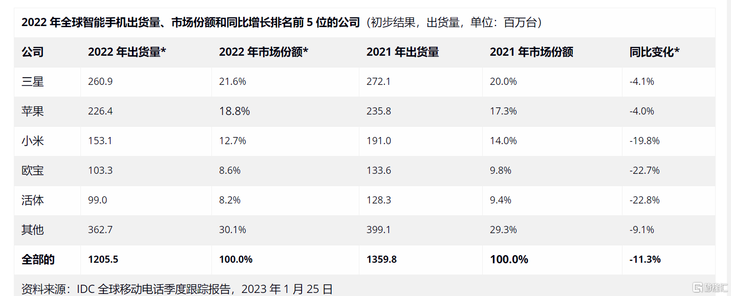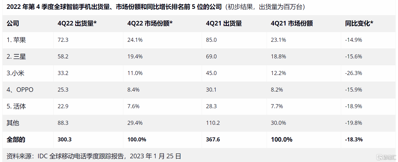 国际数据公司 ( IDC )全球季度手机追踪报告的初步数据,2022 年第四季度 (4Q22) 全球智能手机出货量同比下降 18.3% 至 3.003 亿部. 这一跌幅是有史以来最大的单季度跌幅,并导致全年大幅下滑 11.3%。2022 年的出货量为 12.1 亿台,这是自 2013 年以来的最低年度出货量,原因是消费者需求大幅下降、通货膨胀和经济不确定性。年关如此艰难,预计 2023 年 2.8% 的复苏将面临严重的风险,预测面临严重的下行风险。