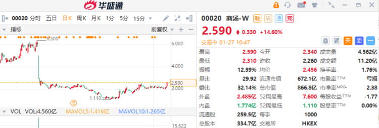 1月27日讯,商汤-W(00020)股价今日继续走高,截至发稿,商汤涨12.39%,报2.54港元,成交额超9.8亿港元。