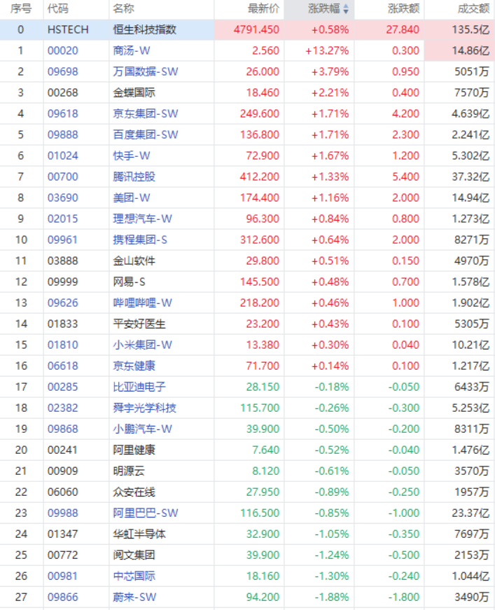 AI龙头商汤-W飙涨13.27%,股价创近半年新高;科技股涨跌不一,万国数据-SW现涨超3%,京东集团-SW、百度集团-SW涨近2%,阿里巴巴-SW跌近1%。