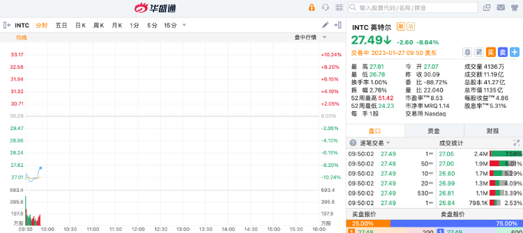 英特尔大跌8.64%,公司Q4业绩暴雷,Q4营收140.4亿美元,低于预期的145.13亿美元;调整后每股盈余0.1美元,低于预期的0.19美元。公司预计Q1调整后每股亏损0.15美元,预期为每股盈余0.25美元。美国银行将英特尔的目标价从28美元降至25美元;摩根大通将英特尔目标价从32美元降至28美元。