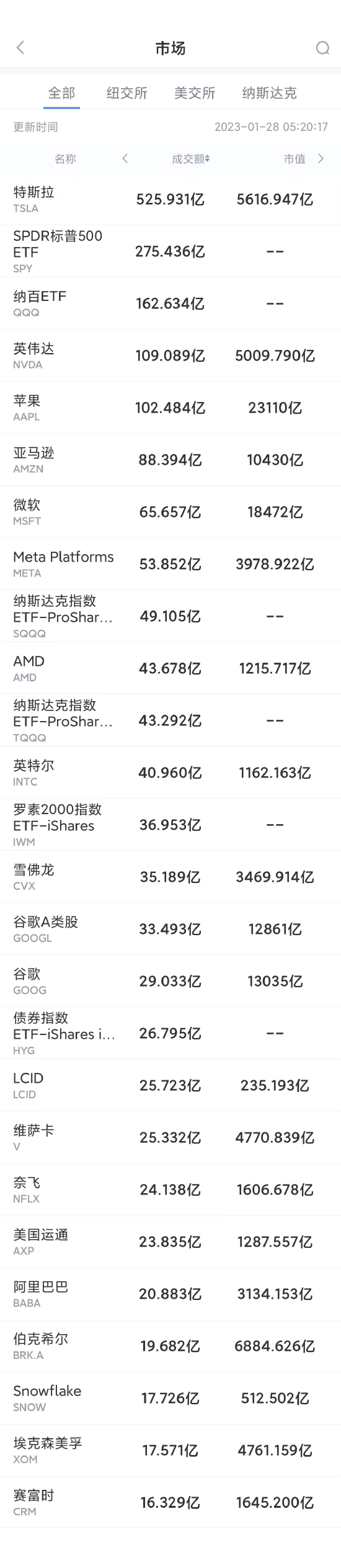 以下为美股当日交易最活跃的20只股票(按成交额):