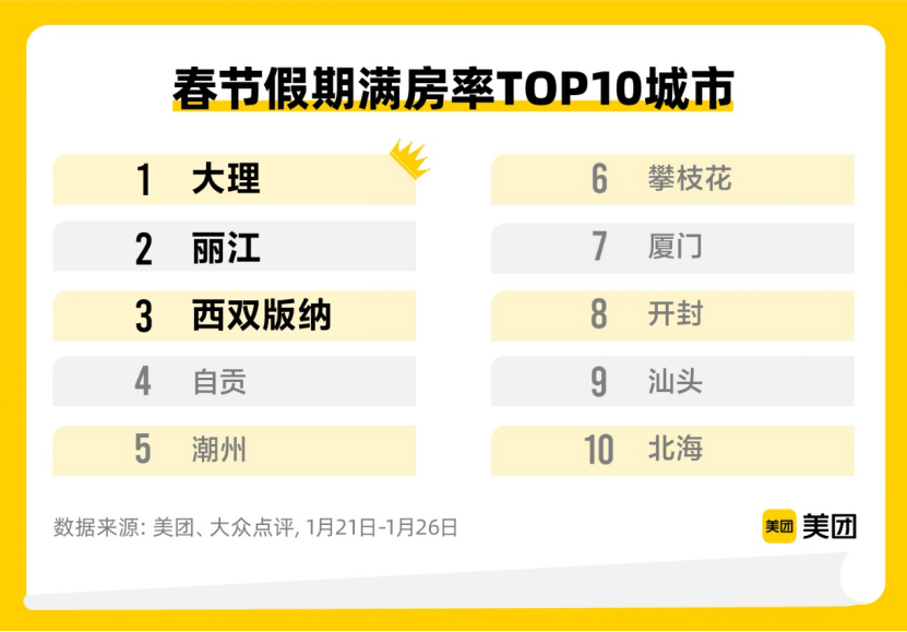美团数据则显示,在住宿入住量最高的前20座城市中,西安、长沙、南京、杭州、洛阳等地同比均翻倍增长;满房率最高的城市包括大理、丽江、西双版纳、自贡、潮州、攀枝花、厦门、开封、汕头、北海等。