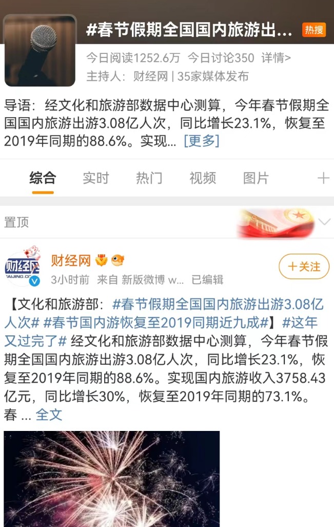 1月28日是兔年春节后的首个工作日,“春节假期国内旅游出游3.08亿人次,恢复至疫情前2019年同期的88.6%”的消息也在今日登上了微博热搜。