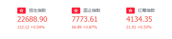 三大指数收盘上涨,恒生指数涨0.54%,成交972.5亿港元。恒生科技指数涨1.04%,恒生国企指数涨0.87%。