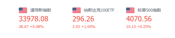 道指涨0.08%报33978.08点,标普500指数涨0.25%报4070.56点,纳指涨0.95%报11621.71点。