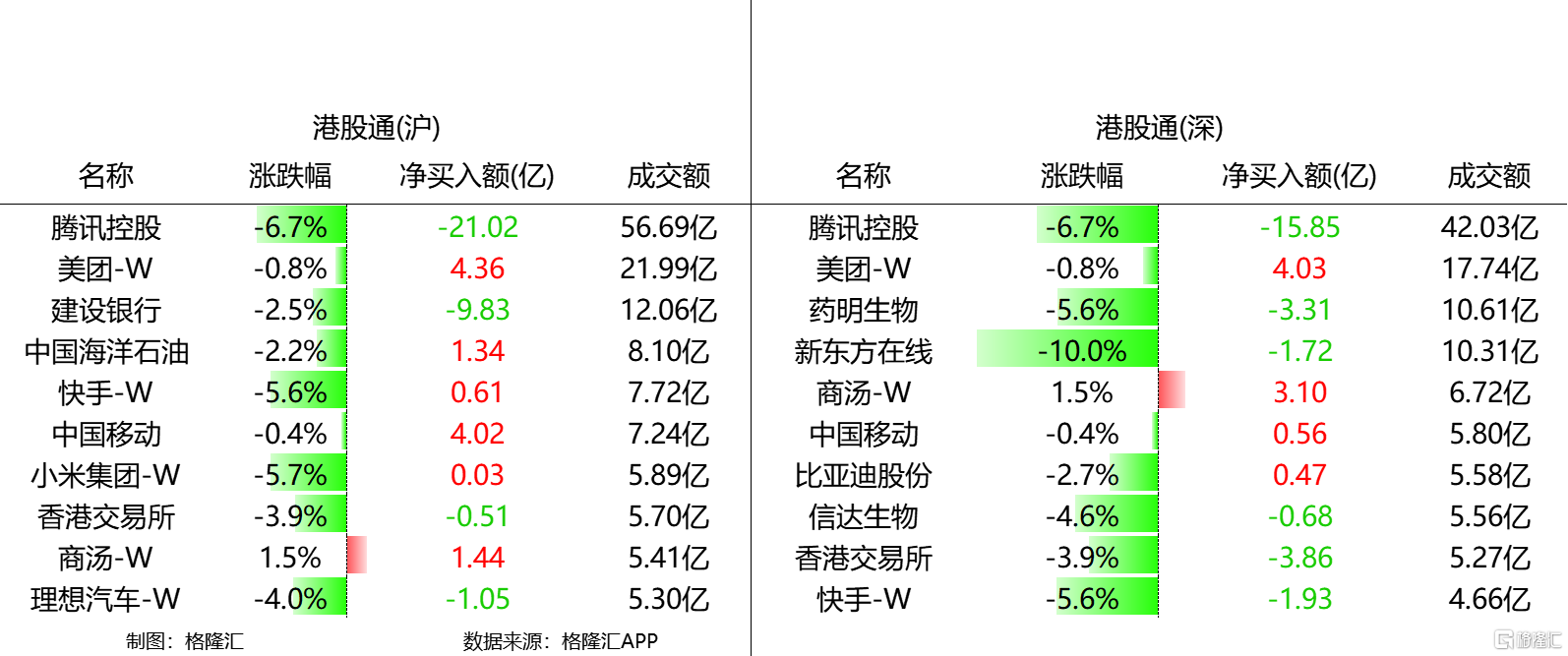 格隆汇1月30日丨南下资金今日净卖出港股69.04亿港元。腾讯控股、建设银行、香港交易所分别遭净卖出36.87亿港元、9.83亿港元、4.37亿港元;美团-W、中国移动、商汤-W分别逆势获净买入8.39亿港元、4.58亿港元、4.54亿港元。