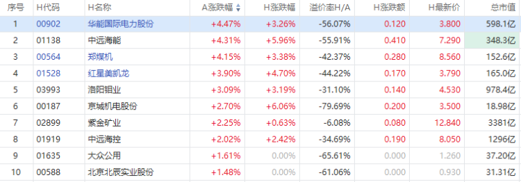 截至A股收盘,AH股涨幅前10如下: