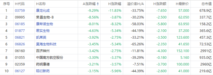 康龙化成A股跌9.29%,H股跌超11%;荣昌生物A股跌8.56%,H股跌超3.87%;康希诺生物A股跌超8%,H股跌8.32%。