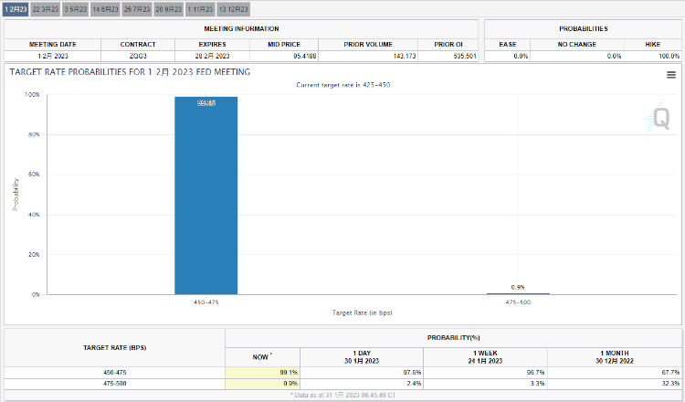 CME利率预测工具显示,美联储下次加息25个基点的概率为99.1%。