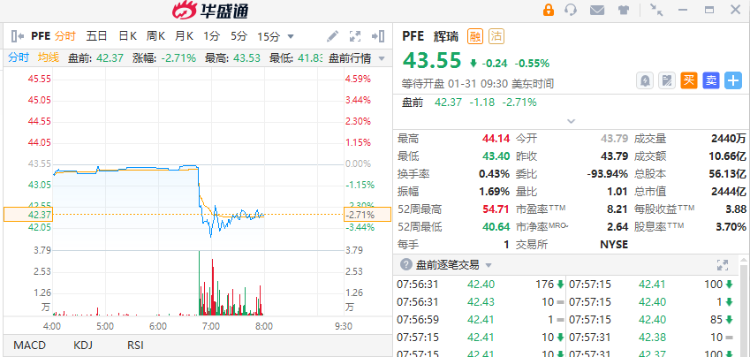 辉瑞第四季度营收243亿美元,预估242.3亿美元;第四季度调整后每股收益1.14美元,上年同期1.08美元。辉瑞预计2023年营收670亿美元至710亿美元,预估为717.5亿美元;预计2023年调整后每股收益3.25美元至3.45美元,预估4.31美元。截止北京时间20:57,辉瑞盘前跌2.71%,报42.37美元。