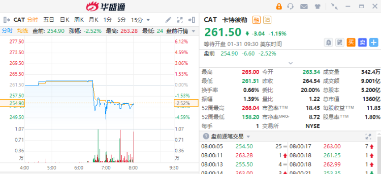 卡特彼勒第四季度营收166亿美元,市场预估158.8亿美元;每股收益2.79美元,上年同期3.91美元;调整后每股收益3.86美元,市场预估3.97美元;调整后运营收益28.1亿美元,市场预估25.4亿美元。截至北京时间21:00,公司股价盘前跌2.52%。