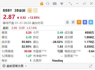 3B家居盘前涨超4%,报道称该公司正准备最早于本周申请破产保护,并已安排清盘人关闭更多门店,除非在最后时刻出现买家。不过散户热情不减,该股周一大涨12.55%。
