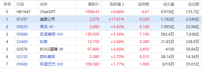 华盛资讯2月1日讯,港股ChatGPT概念股今日盘中再度活跃,美图公司现涨超17%,商汤-W、百度集团-SW续涨超5%。