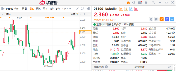 2月1日讯,协鑫科技(3800.HK)午后拉升涨超9%,现报2.36港元,暂成交10.84亿港元,总市值639亿港元。