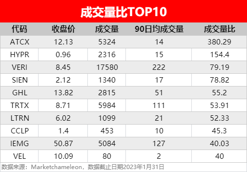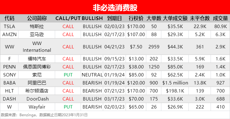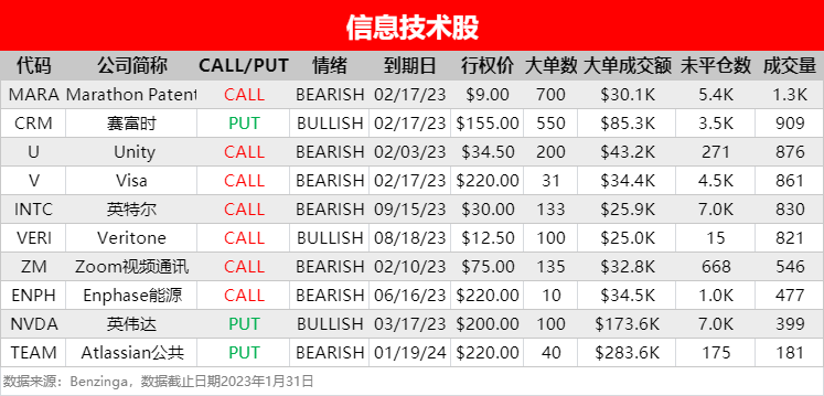 周二(1月31日),非必选消费、信息技术和通讯服务板块相关个股出现较多活跃单,按照当日成交量排行,榜单TOP分别如下: