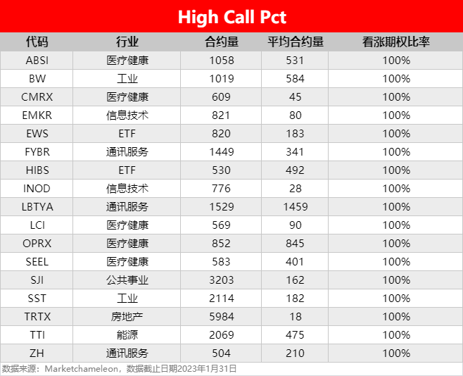 当日Call单比率达到100%的个股为17只, 前值15只,其中中概股知乎 $ZH 看涨期权比率达到100%。