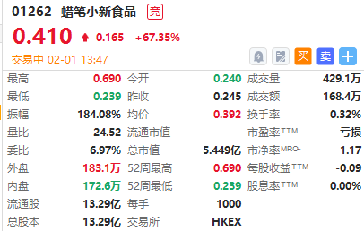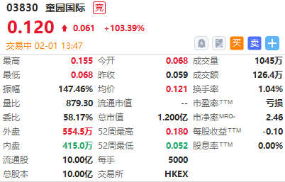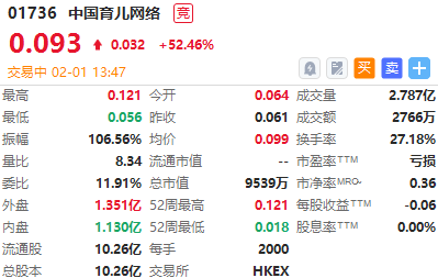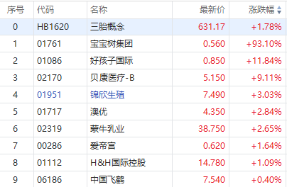 港股生育概念午后持续飙升,童园国际一度暴涨150%,现涨103%,宝宝树涨93%,蜡笔小新食品涨67%,中国育儿网络涨52%。