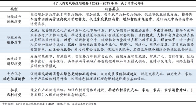 海通证券研究表示,中长期角度,《扩大内需战略规划纲要(2022—2035年)》为我们明确了全面促进消费的方向。