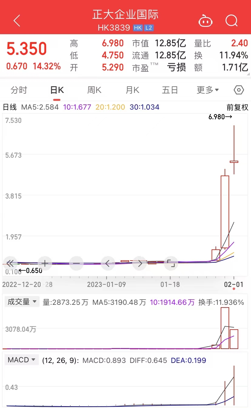 谢家旗下港股上市公司正大企业国际(03839.HK)近期股价持续飙升,至今天上午最高6.98港元,暴涨近8倍。图片来源:同花顺