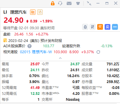 理想汽车盘前涨超6%,截至发稿涨6.27%。理想汽车发布公告,1月交付量为15,141辆,同比增长23.4%。