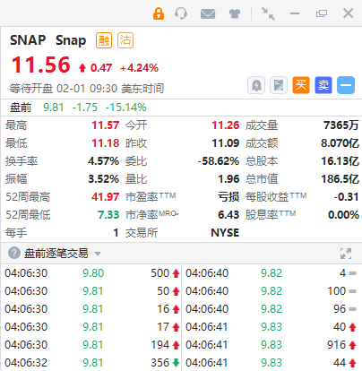 Snap盘前跌超15%,Q4营收13亿美元,为公司有史以来第一个营收没有增长的季度;公司表示其“内部预测”2023年Q1营收将下降2%至10%。