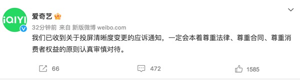 据报道,1月31日,广东一名用户因限制投屏将爱奇艺告上法庭,北京市互联网法院已于近日立案。对此,爱奇艺官微发文称,“已收到关于投屏清晰度变更的应诉通知,一定会本着尊重法律、尊重合同、尊重消费者权益的原则认真审慎对待。 ”
