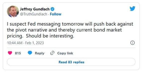 有“新债王”之称的双线资本(DoubleLine Capital)创始人兼首席执行官杰弗里·冈拉克(Jeff Gundlach)表示,美联储可能会推翻市场关于其即将停止加息并在年底前开始降息的说法。他表示:“我认为,美联储明天传递的信息将会推翻市场关于政策转向的叙事,从而影响当前债券市场的定价。这应该会很有趣。”