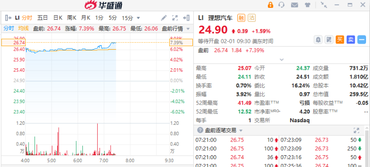 理想汽车公告,1月交付量为15,141辆,同比增长23.4%。自交付以来,理想汽车累计交付量已达到272,475辆。此外,理想L7即将正式发布。截至北京时间20:26,理想汽车盘前涨7.39%,报26.74美元。