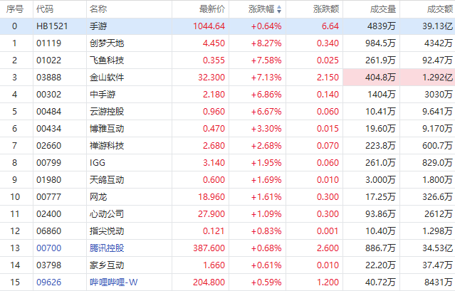 2月2人讯,手游股今日走高,截至发稿,创梦天地(01119)涨8.27%,金山软件(03888)涨7.13%,中手游(00302)涨6.86%,腾讯(00700)涨0.68%,报387.6港元。