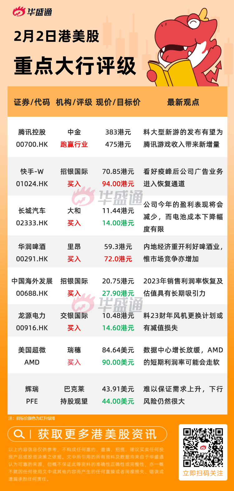 编者按:中金指大型新游发布将为腾讯游戏收入带来新增量;大和削价长城汽车,预期其年内盈利表现下降;巴克莱表示辉瑞下行风险较大,目标价降至44美元>>